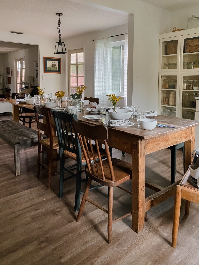 I woke Monday morning with just the twinge of a wine headache. My normal weekend limit of two glasses had been stretched to three as a result of flickering candlelight, a table full of friends, and my kids blessedly entertained by people other than me. Twelve of us gathered around two long tables pushed together, on chairs and benches that my husband and I have collected from dumpsters, curbs, and thrift stores over the years. Little jars gathered in the same way were all filled up with wildflowers that Luke and I picked early in the morning down the road from our house. Old glass yogurt containers had votive candles burning, the wine was decanted that morning, more candles burned around the house, lamplight filling the rooms, soft music (Louis Armstrong) tinkled in (And I think to myself, What a Wonderful World) on a small speaker in the kitchen. Mismatched glasses and napkins lined the table set with our white dishes and to top it all off, the windows were cracked to let in the most delicious winter breeze.