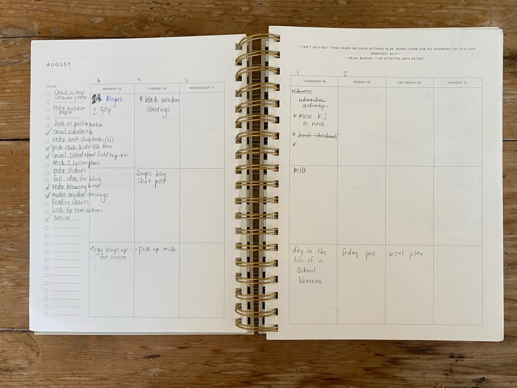 This is an add on “month at a glance” page that I have at the beginning of each month. I use it to plan out blog posts, social media, and my monthly list. Below is a (halfway) filled in month.